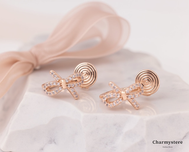 リボン結びのシルエットイヤリング。 上品でシンプルなデザインで普段使いにはもちろん、お呼ばれやお出かけにも◎ ■Color:Pink ■素材:銅+銀メッキ+ジルコン
