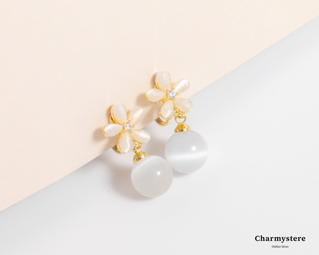 シンプルなキャッツアイのフラワーと、ゆらゆらと揺れるモチーフが大人可愛いアクセサリー。 ■Color:Gold ■素材:銅+金メッキ+ジルコン+キャッツアイ