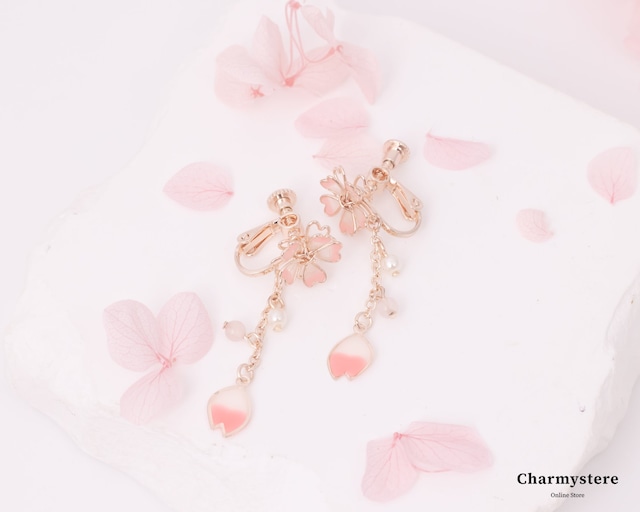 桜の美しい色味を再現し、月のシルエットに花びらを添え女性らしさ溢れるエレガントなアイテム。ゆらゆらと揺れる桜の花びらが視線を引くデザインに。 ■Color:Silver / Pink ■素材:銅+銀メッキ+ジルコン+パール+琺瑯(ほうろう)