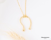 シンプルで洗練されたデザイン。ユニークな形状のペンダントは、流れるような曲線と美しいゴールドの光沢が調和し、どの角度から見ても魅力的です。