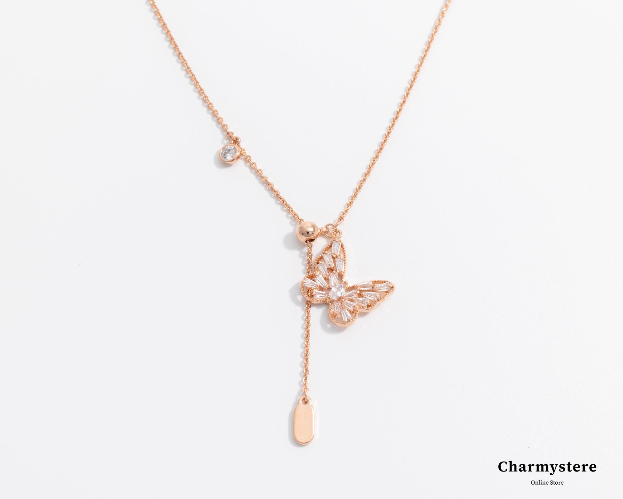 バタフライモチーフのキラキラと煌めくネックレス。デザインがお揃いのピアスと合わせてエレガントなコーデにぴったり。
