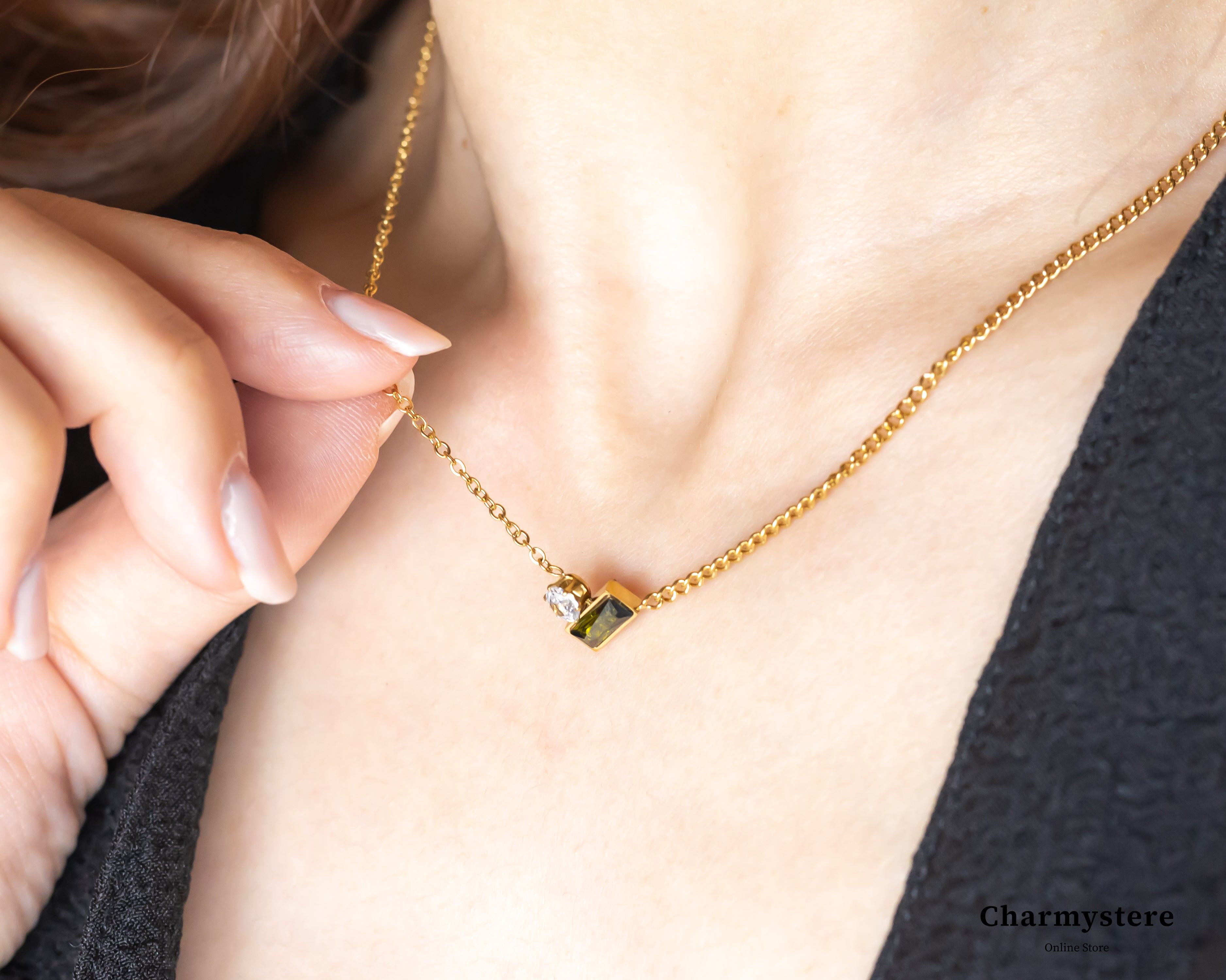 オリーブグリーンの落ち着いたカラースクエアカットのストーンとのコラボレーション。ニュアンス感あるネックレスでジルコンがキラッと煌めきデコルテを彩ります。