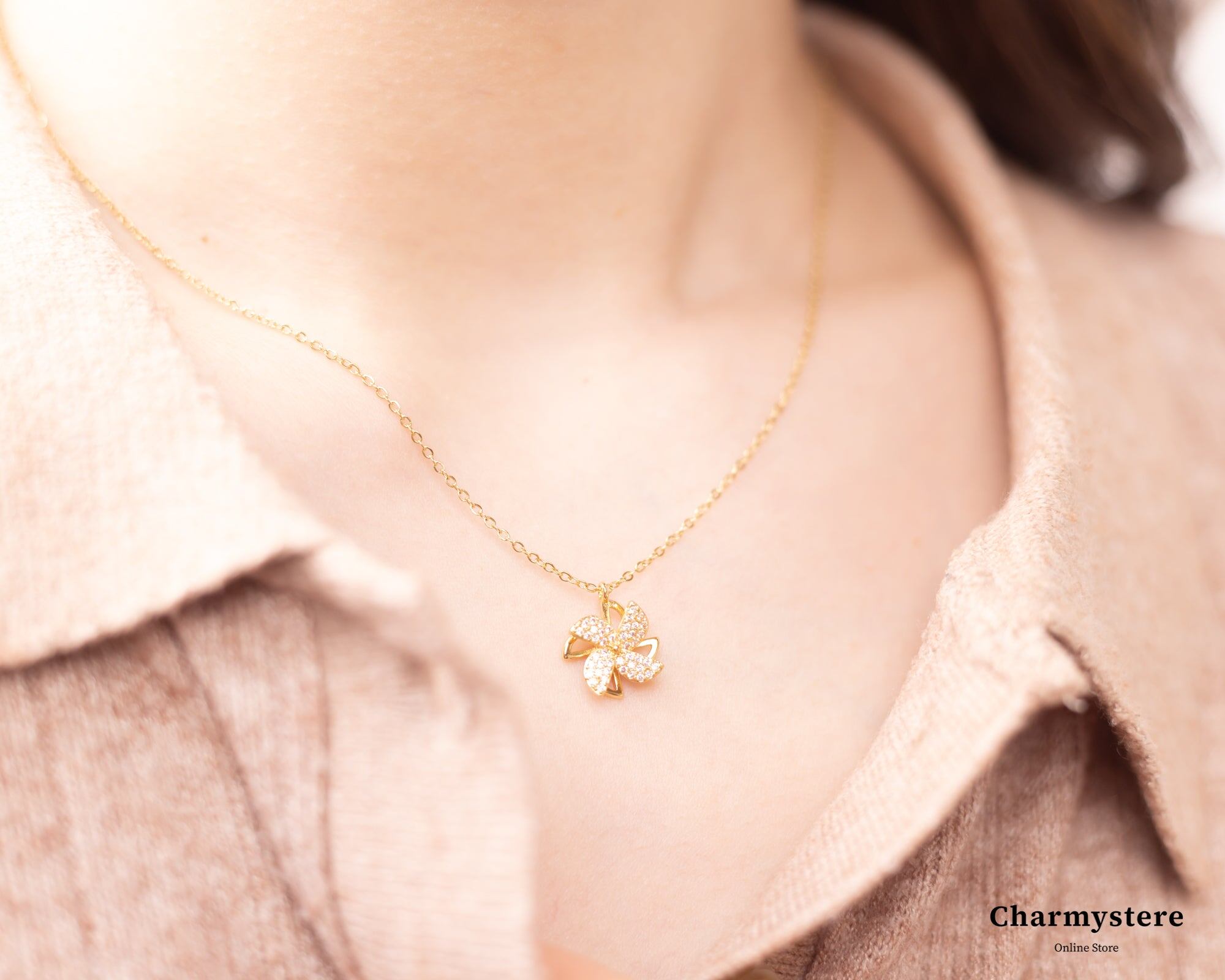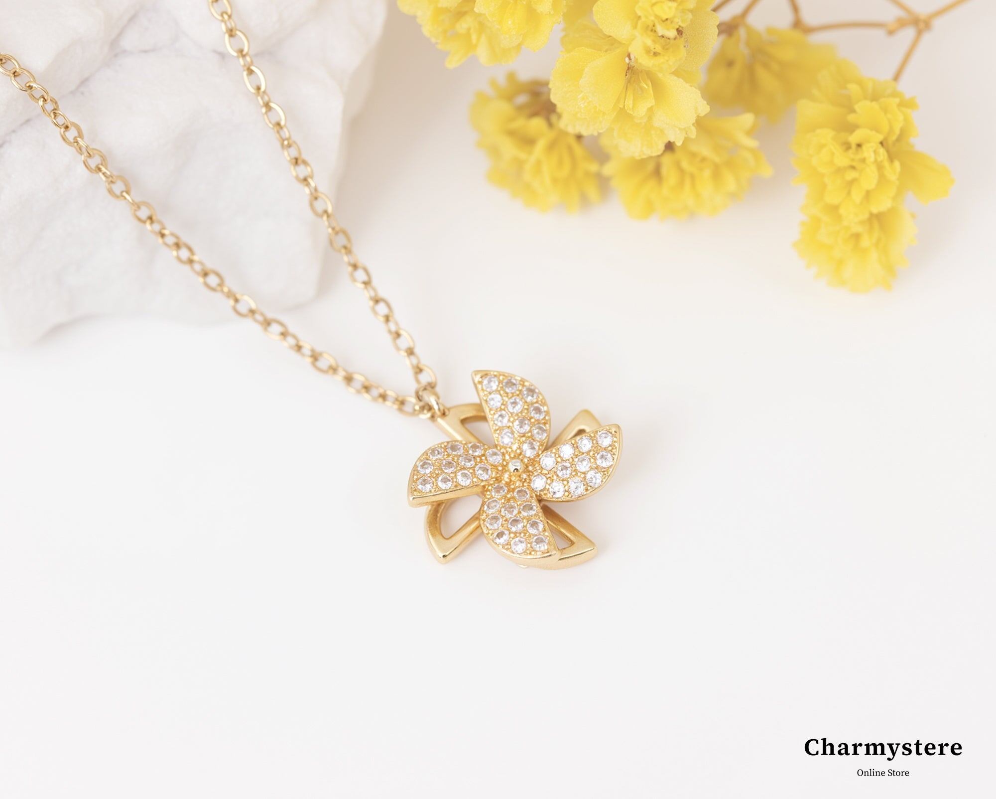 くるくると回る風車のような爽やかなネックレス。デコルテのポイントとなりエレガントな印象に。