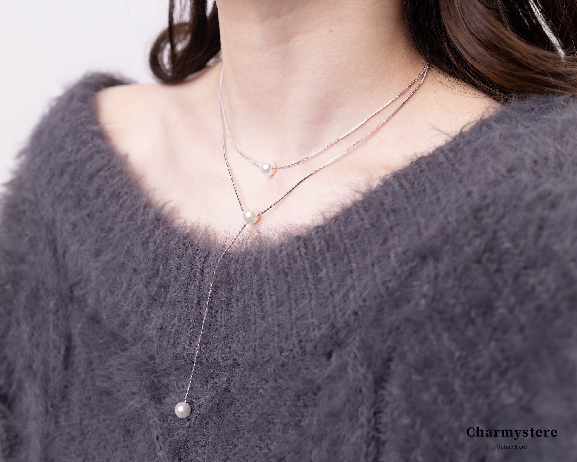 パールがアクセントとなった縦ラインを強調してくれるロングネックレス。