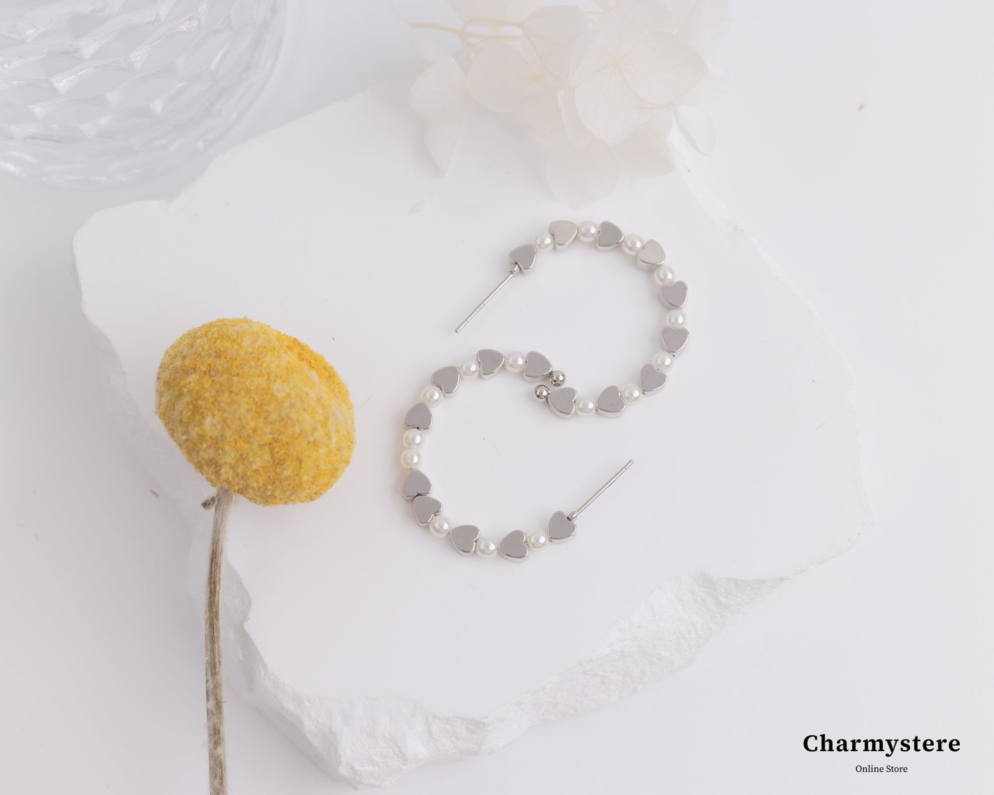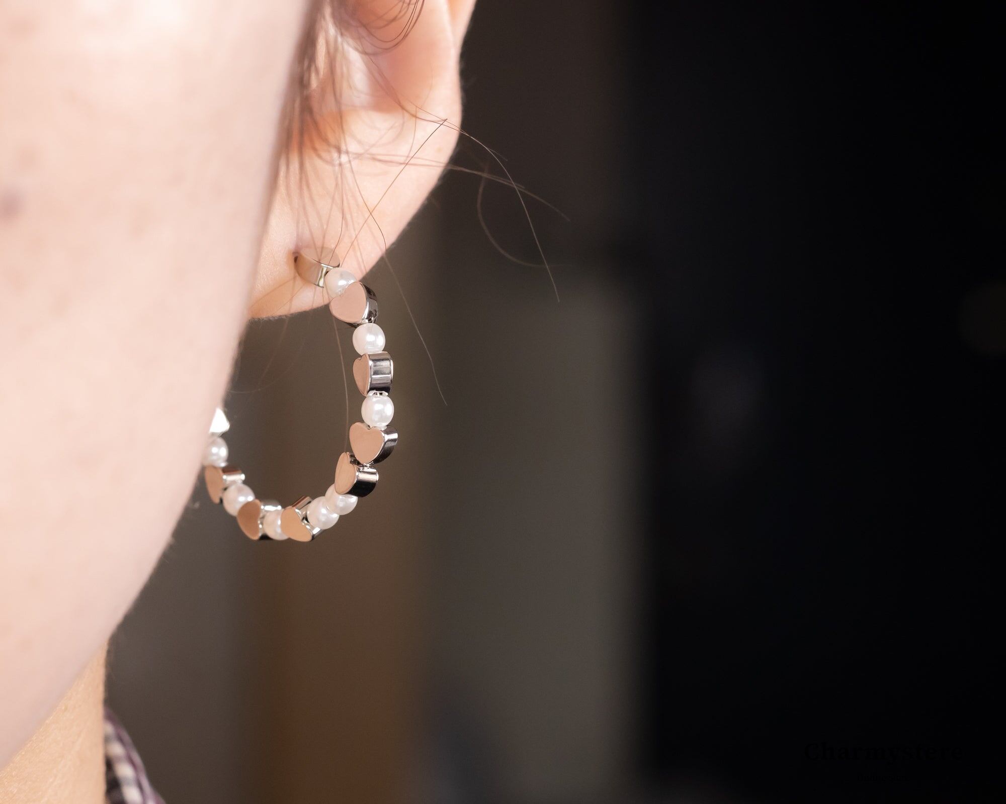 小振りなシルバーハートがカジュアルガーリーさをプラス。大ぶりなリングピアスにすることで顔まわりを華やかに。