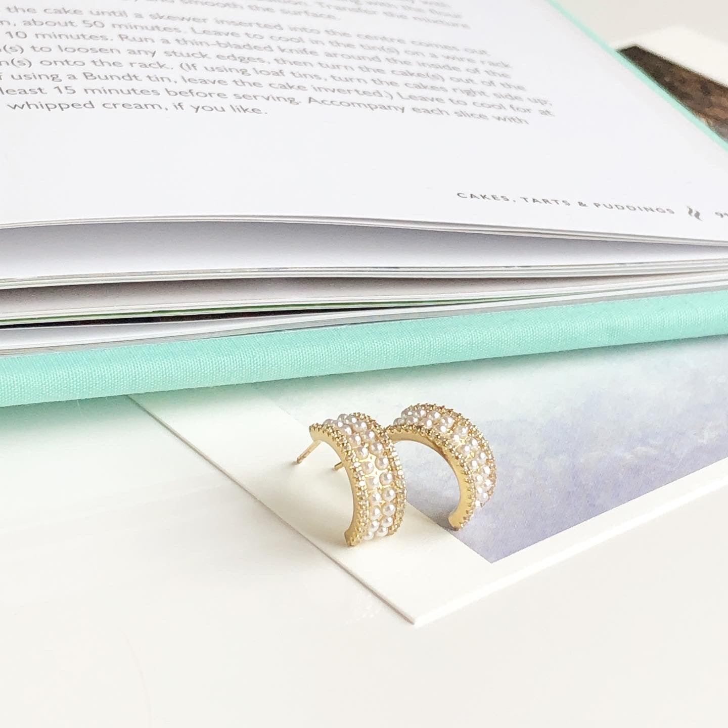 パールで上品な雰囲気のピアス。シンプルなシルエットで場を選ばずに着けることができ万能な美しいデザインです。