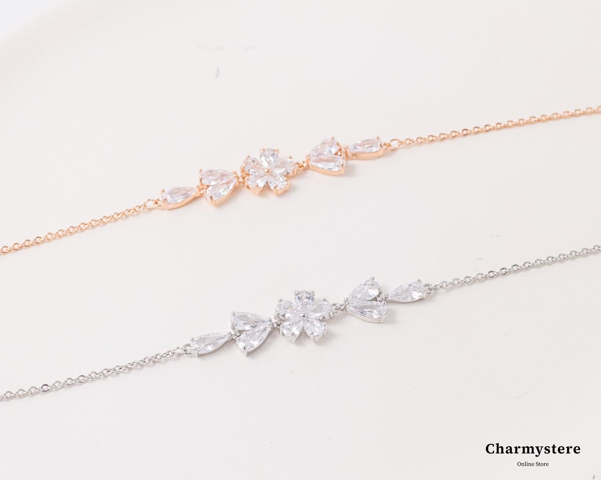 エレガントで洗練されたデザインが特徴のブレスレット。華奢なチェーンに、美しく輝くフラワーモチーフのクリスタルがあしらわれています。