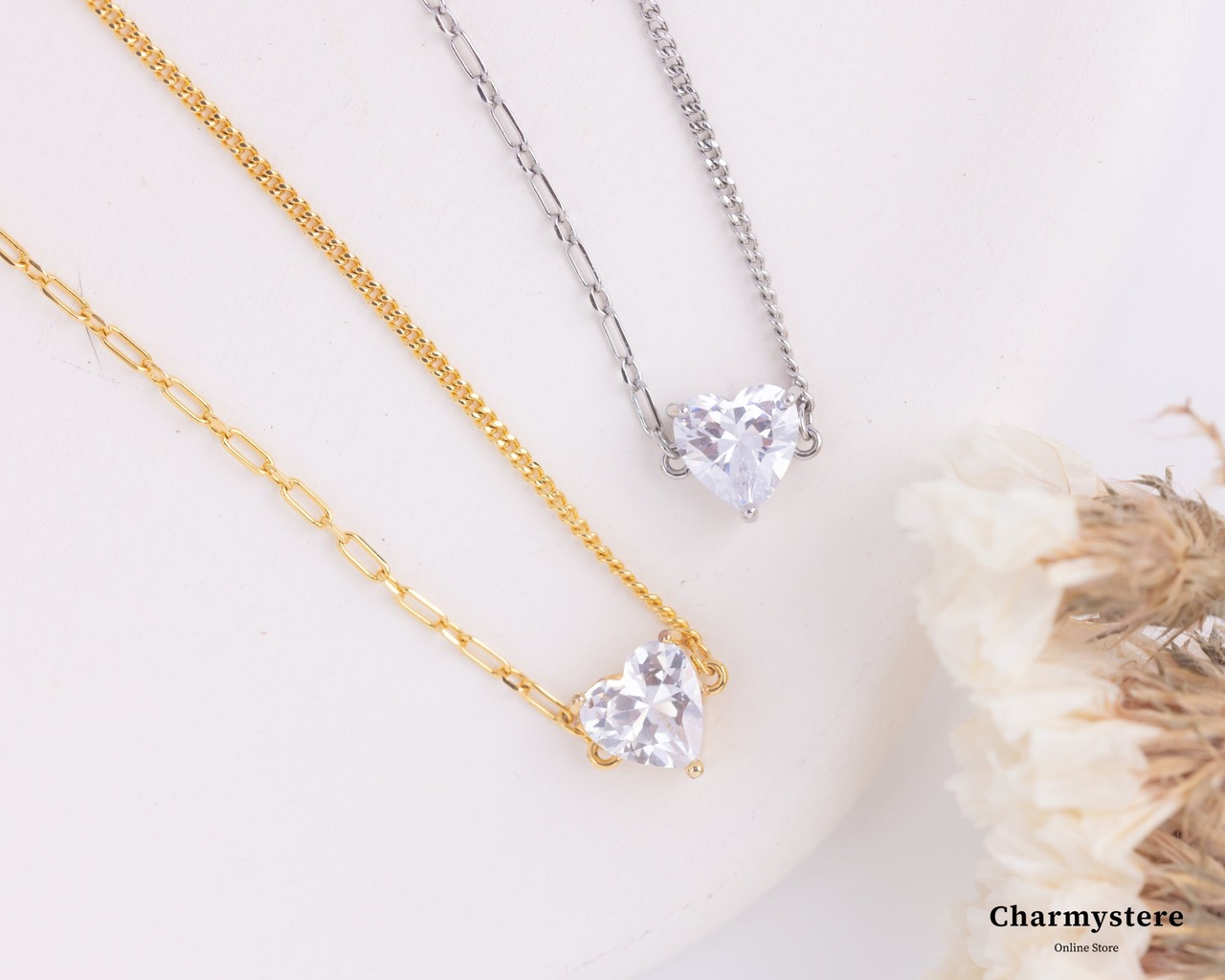 ハートのストーンが足首に煌めく優美なアンクレット。それぞれ異なる細いチェーンで飽きのことない色んな表情を見せるシンプルなデザインに。